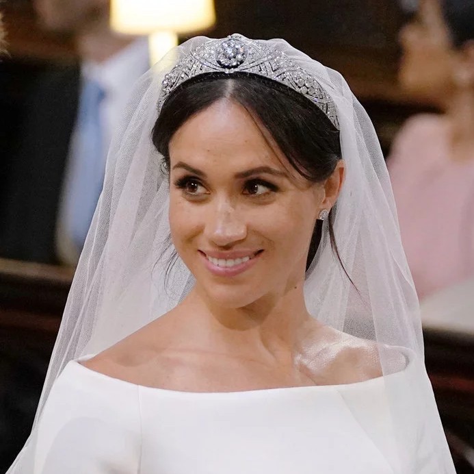メーガンのシンプルなルックに華を添えていたのは、エリザベス女王から借り受けた1932年製のバンドゥ形のダイヤモンドティアラ。