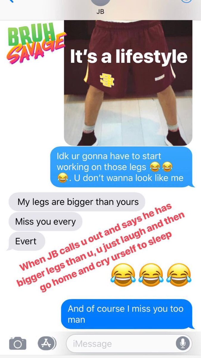 すると、ジャスティンから「俺の脚は君のより大きい」という想定外の返事が。もちろん冗談だとは思うが、とくに絵文字もなければ、日本語でいう“(笑)”を意味する「lol」の文字もない、真面目なトーンで返してきたジャスティンにエヴァートは大爆笑。