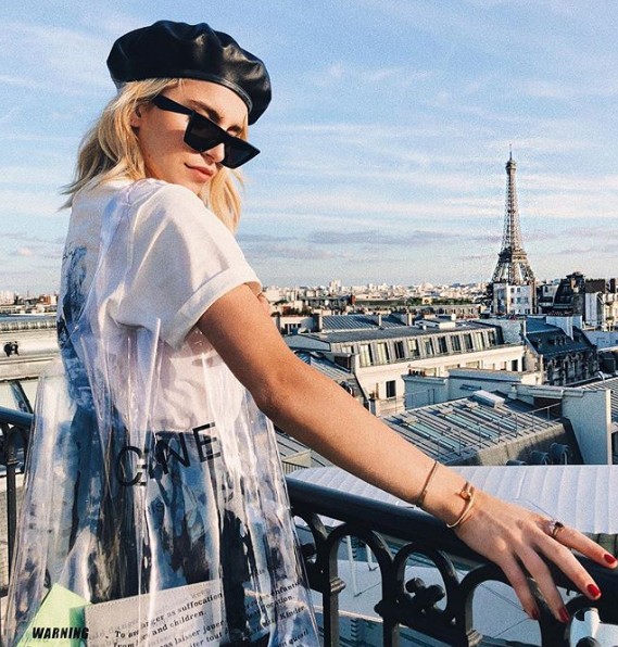 PVCバッグトレンドの火付け役ともなったCÉLINEのPVCトートバッグを早速ゲットしたキャロイン。レザー素材のベレー帽とキャットアイサングラスでエッジーな雰囲気で。