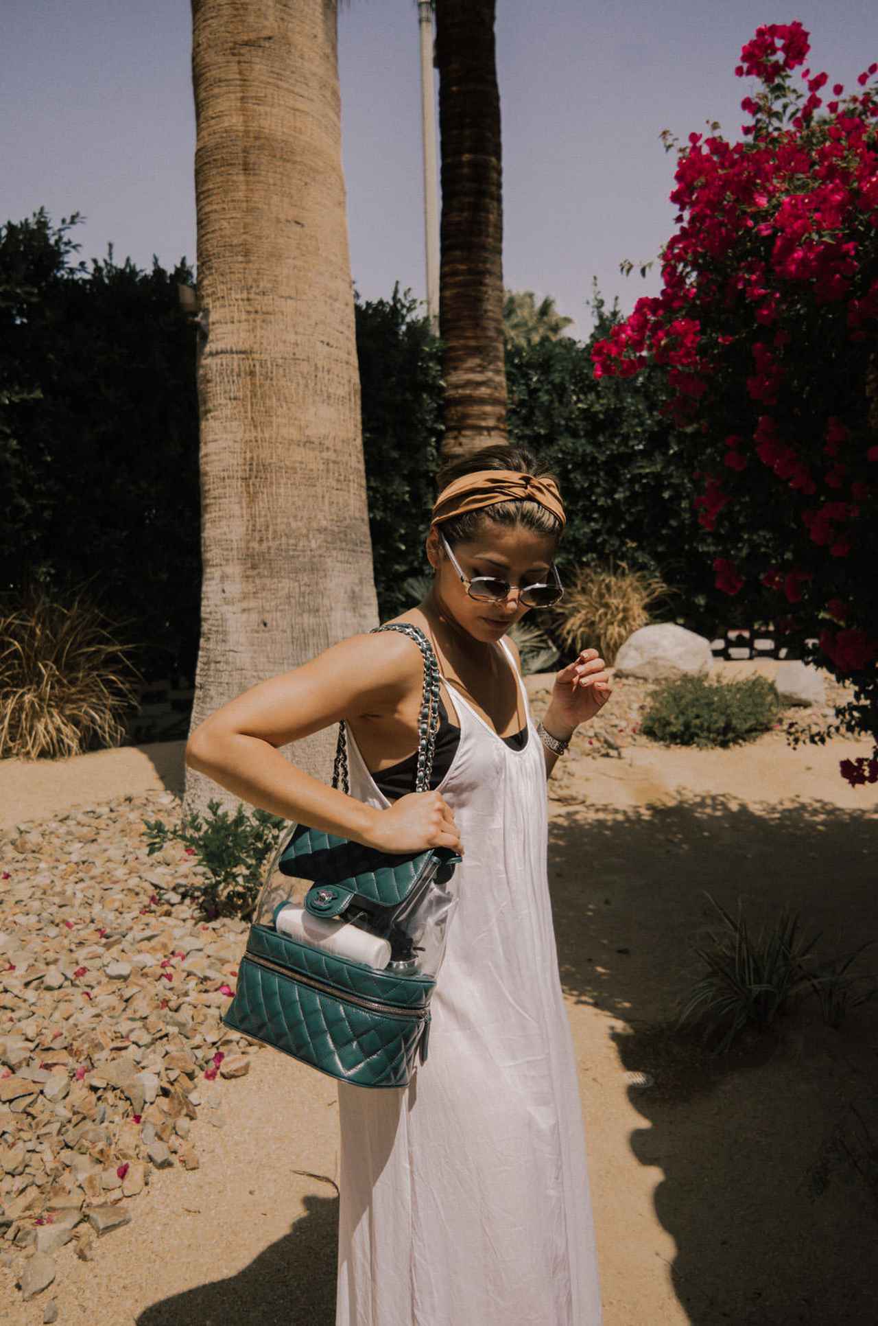 リゾート地にぴったりな白のマキシ丈ワンピースに合わせたのは、CHANELのPVCとキルティング素材がミックスになったバッグパック。PVC素材なら、海辺でも大活躍。