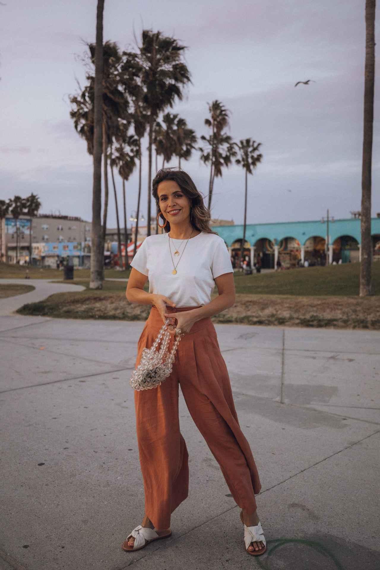 REFORMATIONの白Tシャツに、テラコッタオレンジのワイドパンツをセットし、足元はサンダルで力を抜いたサラ。手に持ったPVCバッグはMANGOのもの。