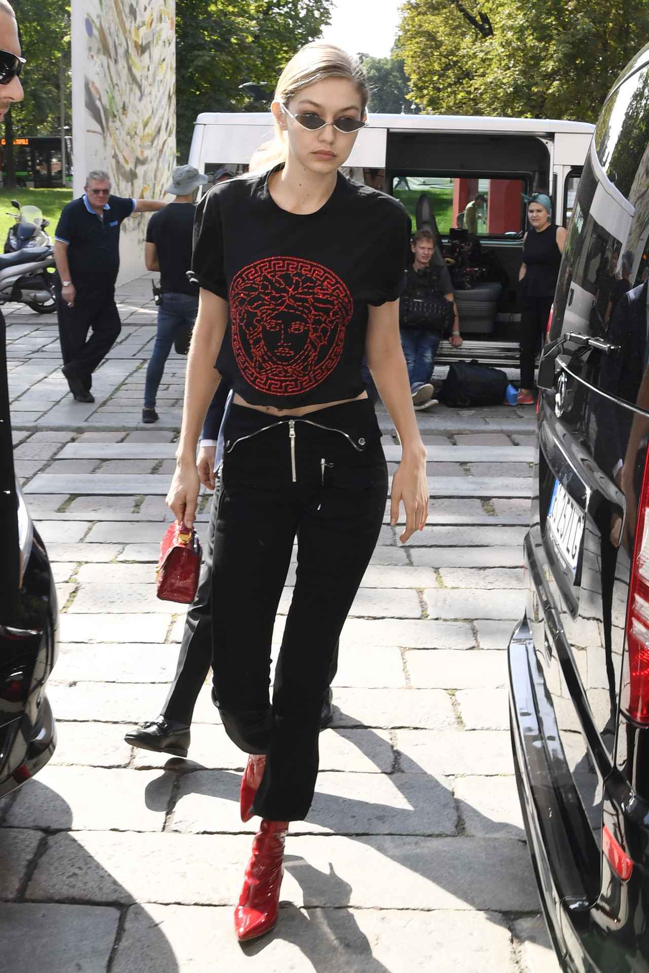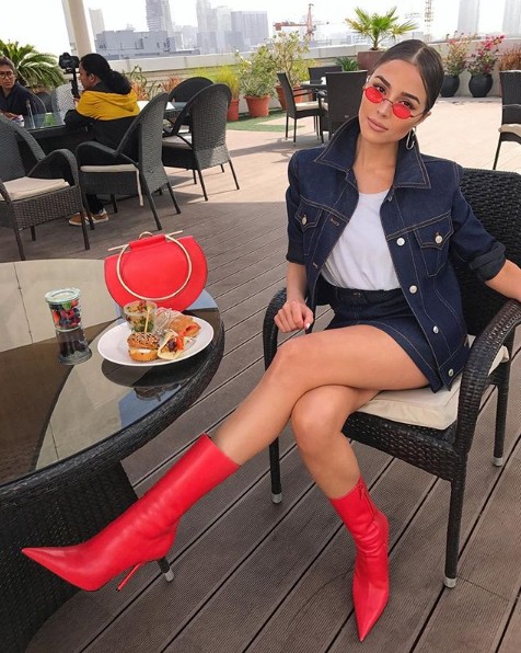 赤くブランドロゴがプリントされたVERSACEのTシャツに合わせて、マイクロミニバッグとSTUART WEITZMANのブーツも赤で統一。裾がフレアシルエットになったデニムはRtaのもの。
