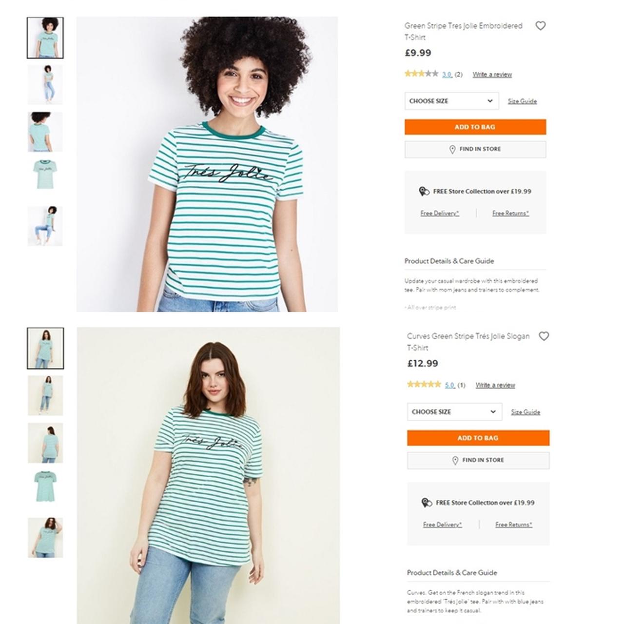さらに胸元にロゴが入ったグリーンぼボーダーTシャツも通常サイズは9.99ポンドなのに対し、プラスサイズは12.99ポンドと、同じく約450円もの価格差が確認できる。