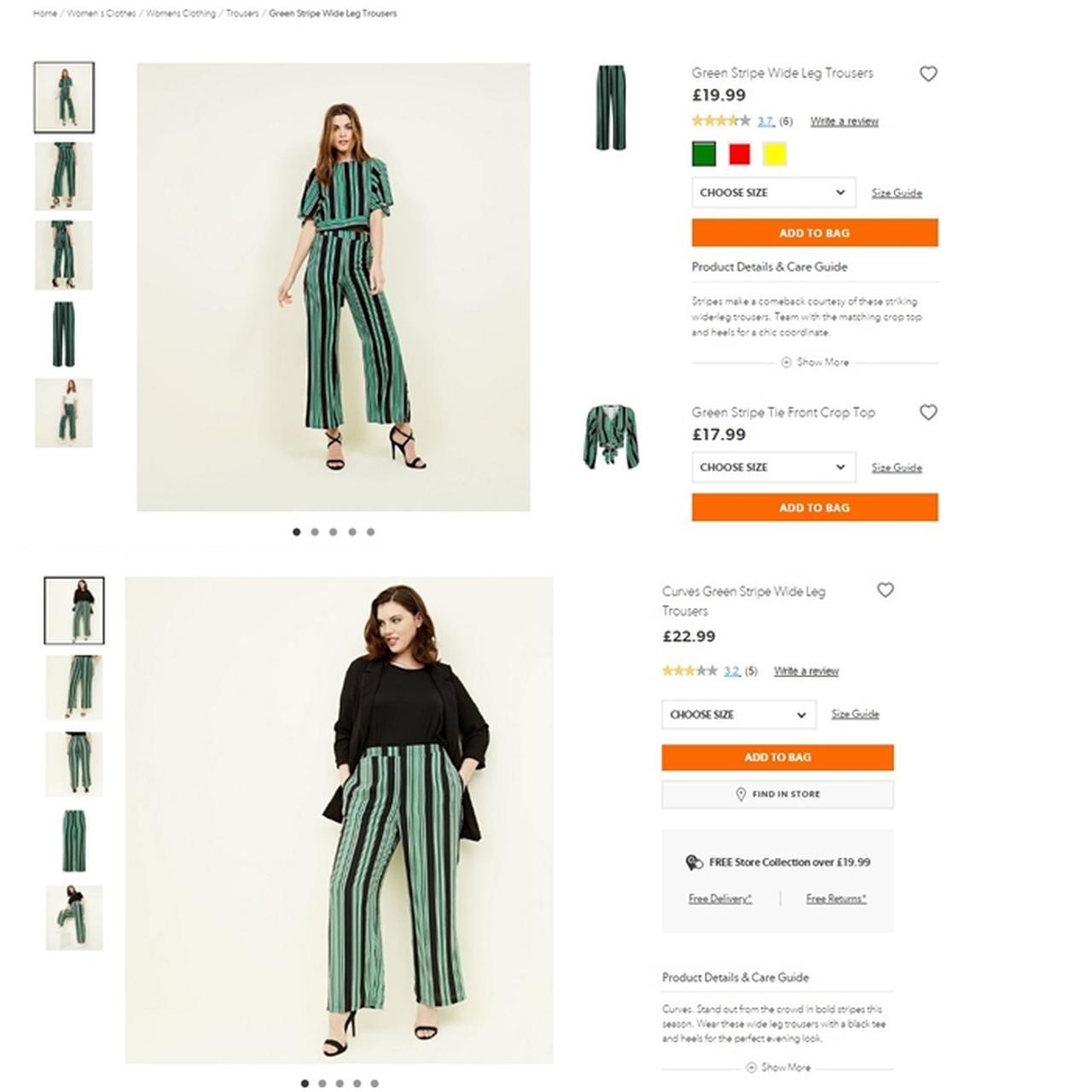 ニュールックは、イギリスサイズで6~16号にあたる通常サイズのストライプ柄ワイドパンツを19.99ポンドで販売しているのに対し、プラスサイズに該当する18~32号の同商品は22.99ポンドで販売。同じデザインながら、日本円にすると、約450円もの価格差がある。
