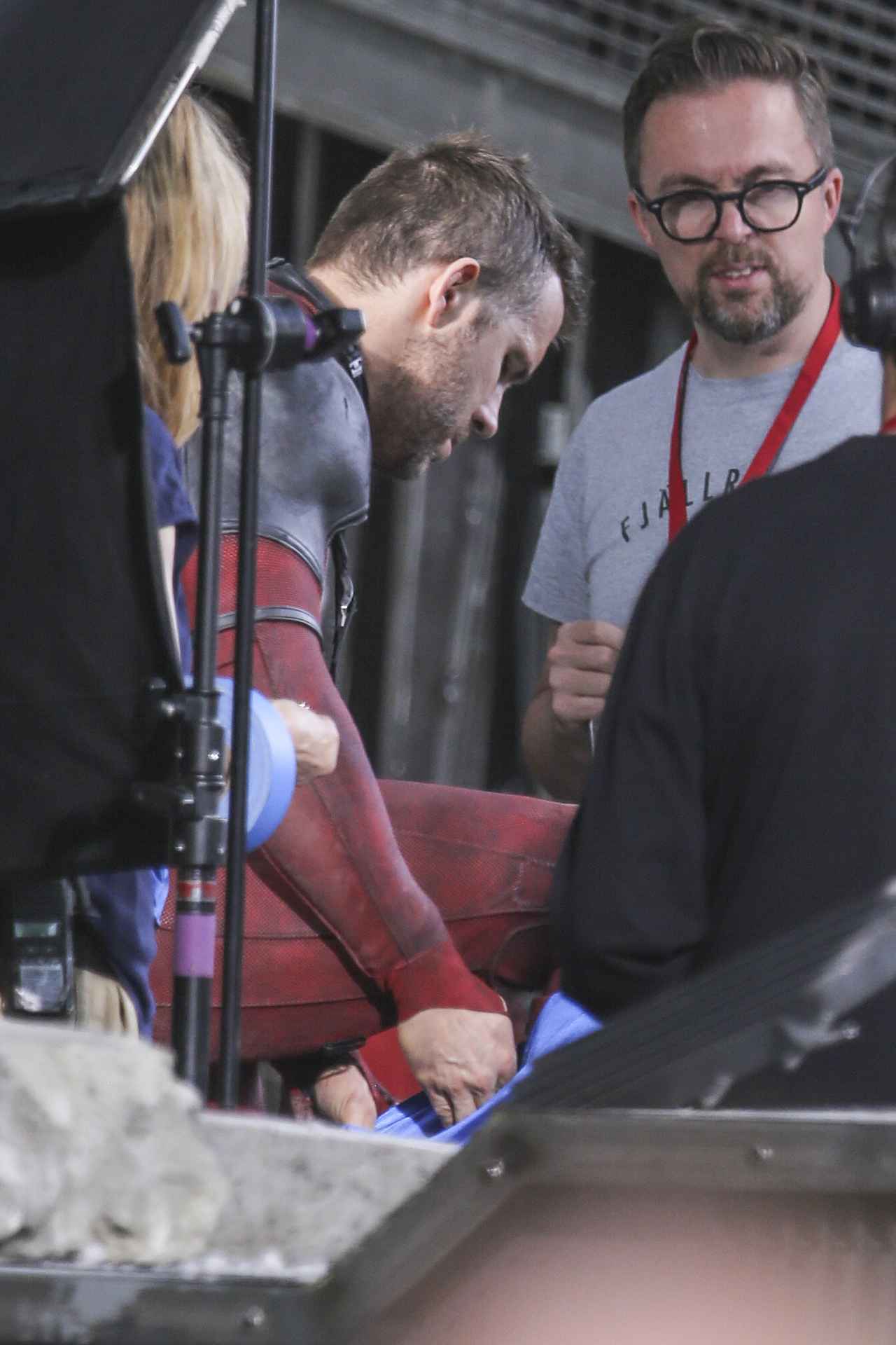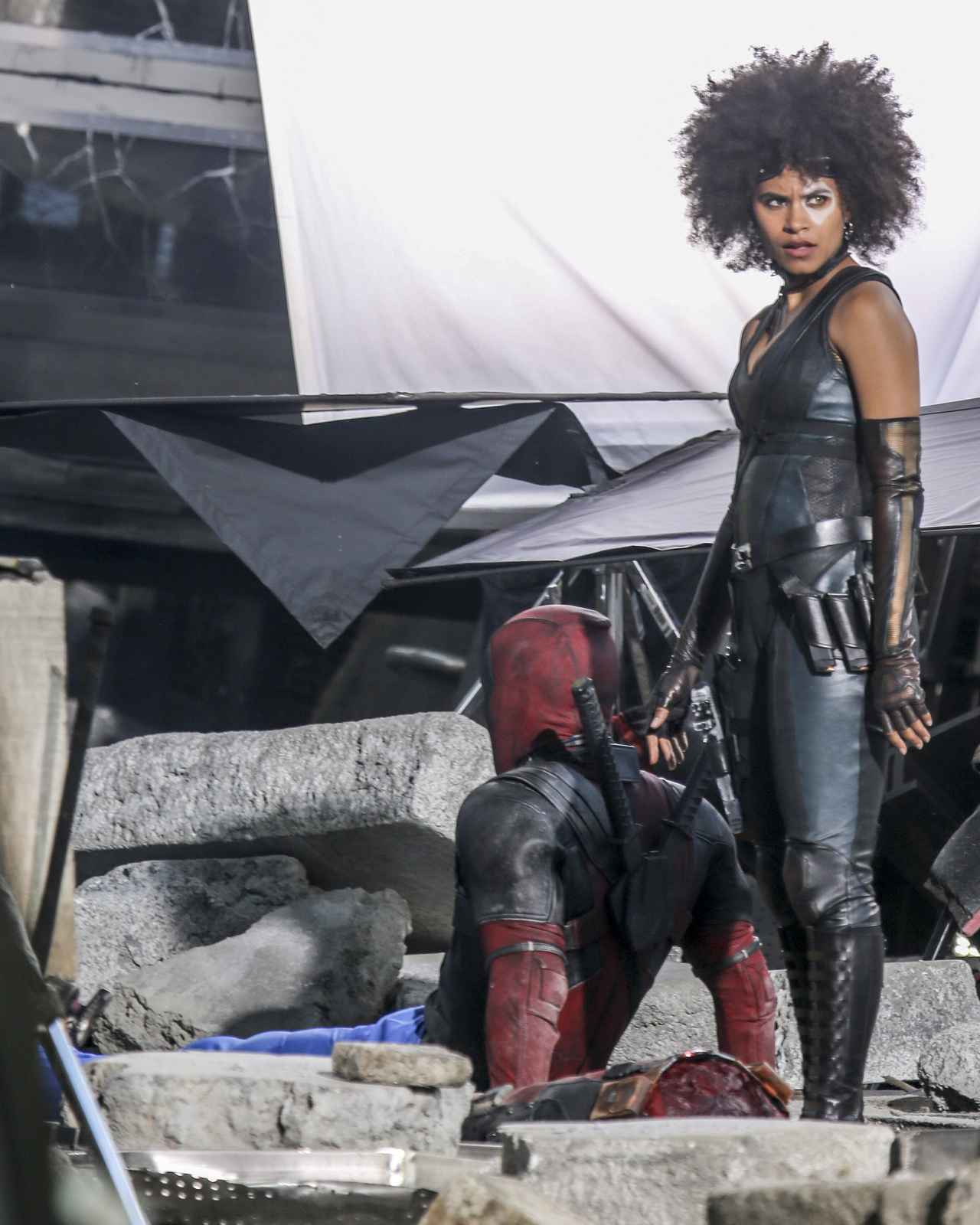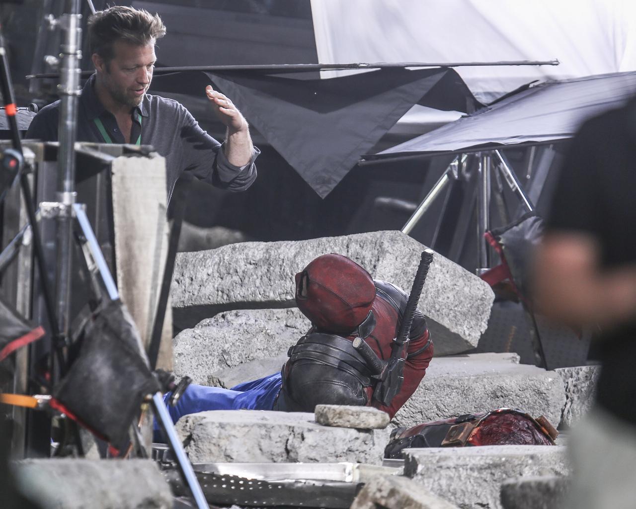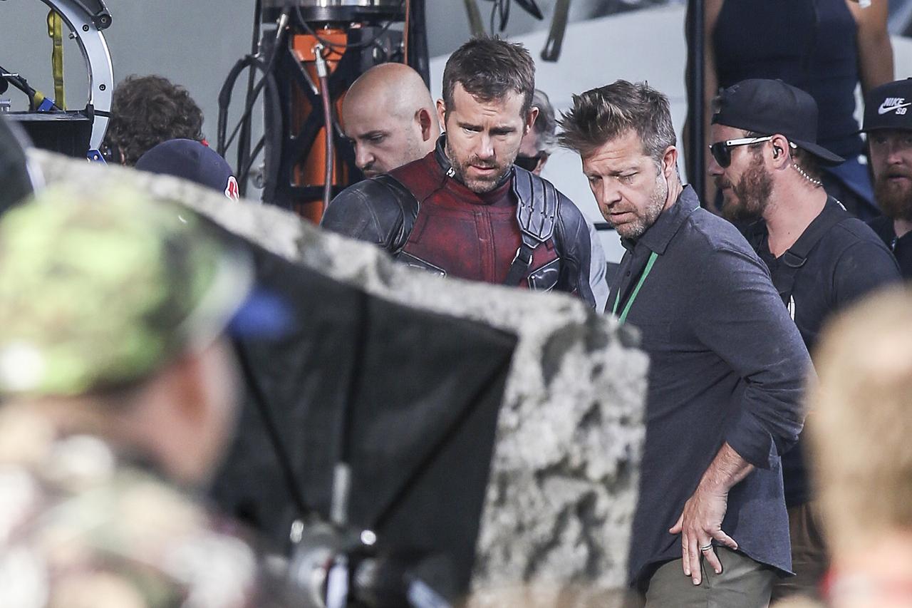 セットにはデッドプールのスーツを着たライアンと、ドミノ役の衣装を着たザジ・ビーツの姿があった。