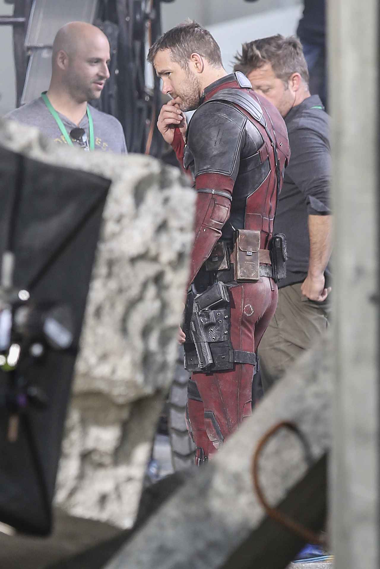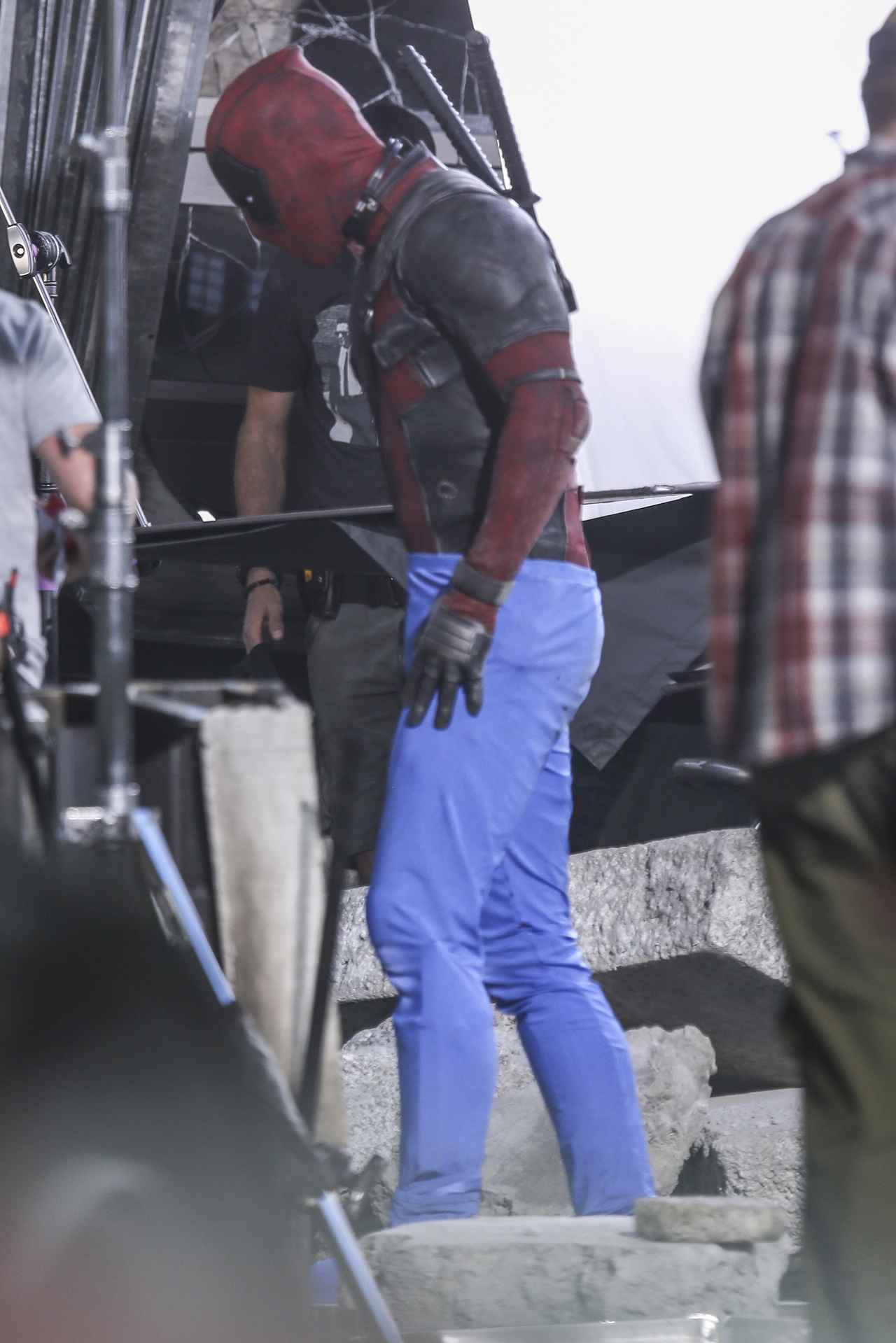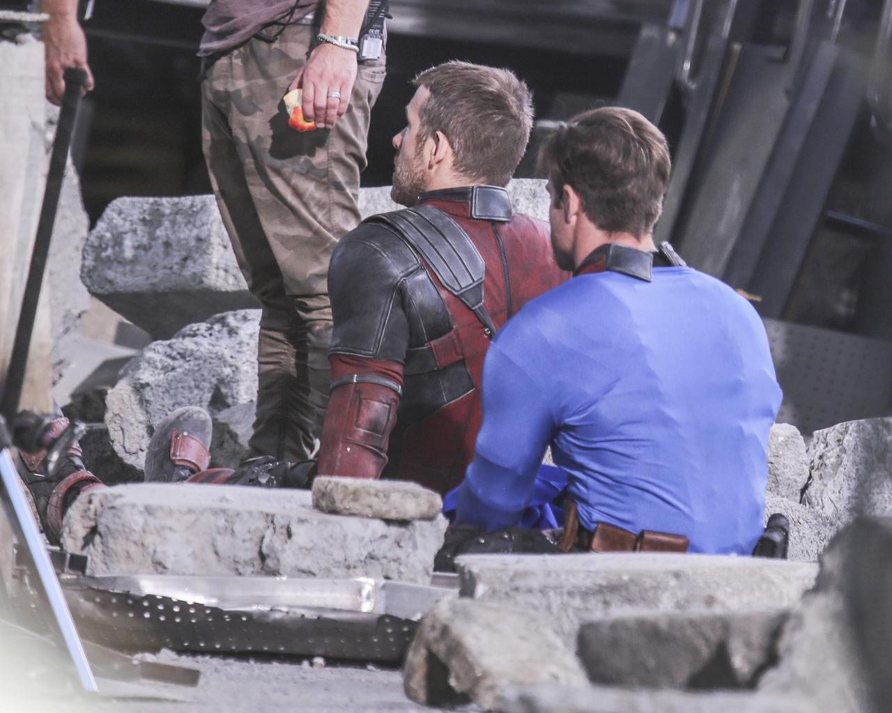 セットにはデッドプールのスーツを着たライアンと、ドミノ役の衣装を着たザジ・ビーツの姿があった。