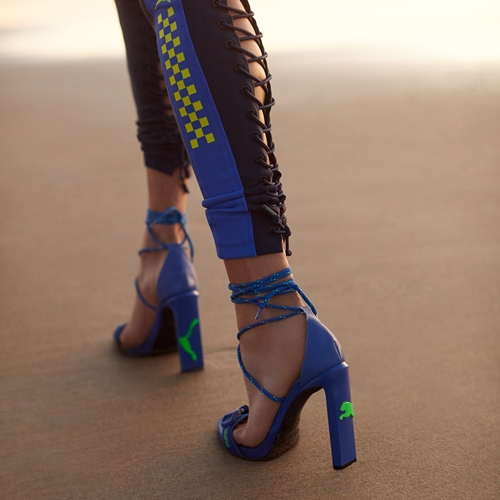 ビーチスタイルの常識を覆すボールドなデザインのハイヒールは、ヒールにあしらわれたプーマのキャットロゴが特徴で、鮮やかな青にアクセントで使われた緑色のロゴマークがフレッシュな印象を与える。
