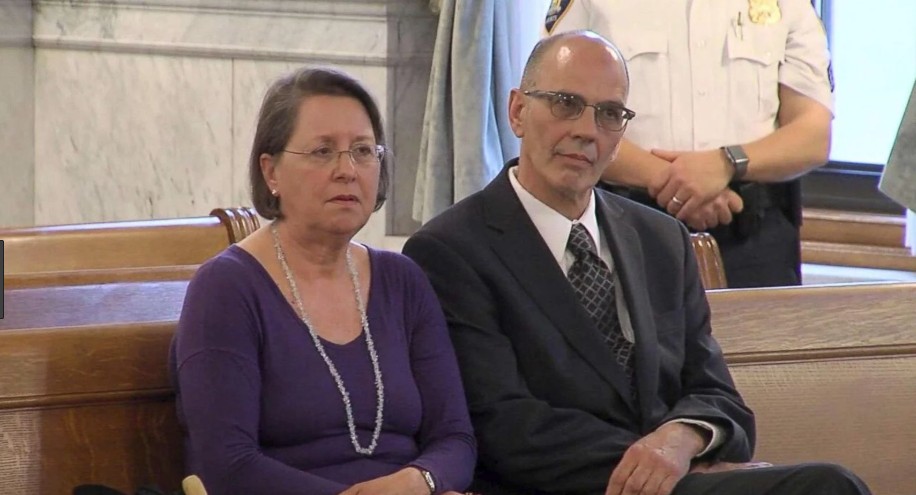 裁判所で判決が下されるのを待つ、マイケルの両親。