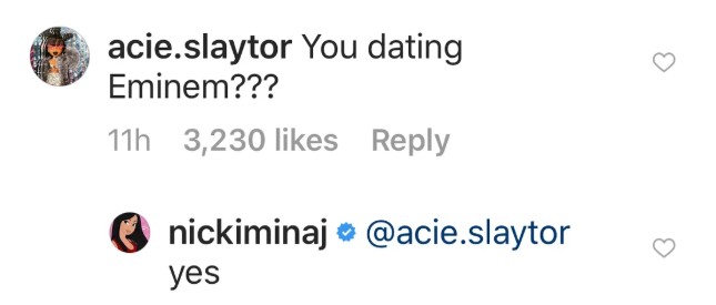 コメント欄に2人の交際を疑う声が殺到するなか、「エミネムと付き合っているの?」というあるファンのコメントに、なんとニッキーが「イエス」と回答。
