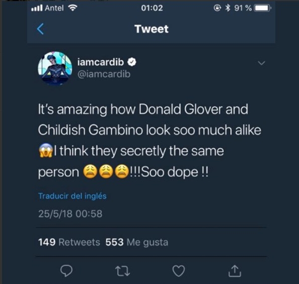 しかし、チャイルディッシュとダニエルが同一人物だと知らなかったカーディは、自身のツイッターに「驚いてしまうほどドナルド・グローバーとチャイルディッシュ・ガンビーノってとってもそっくり。こっそり彼らは同じ人だと思っているわ。やばいよね」とコメント。