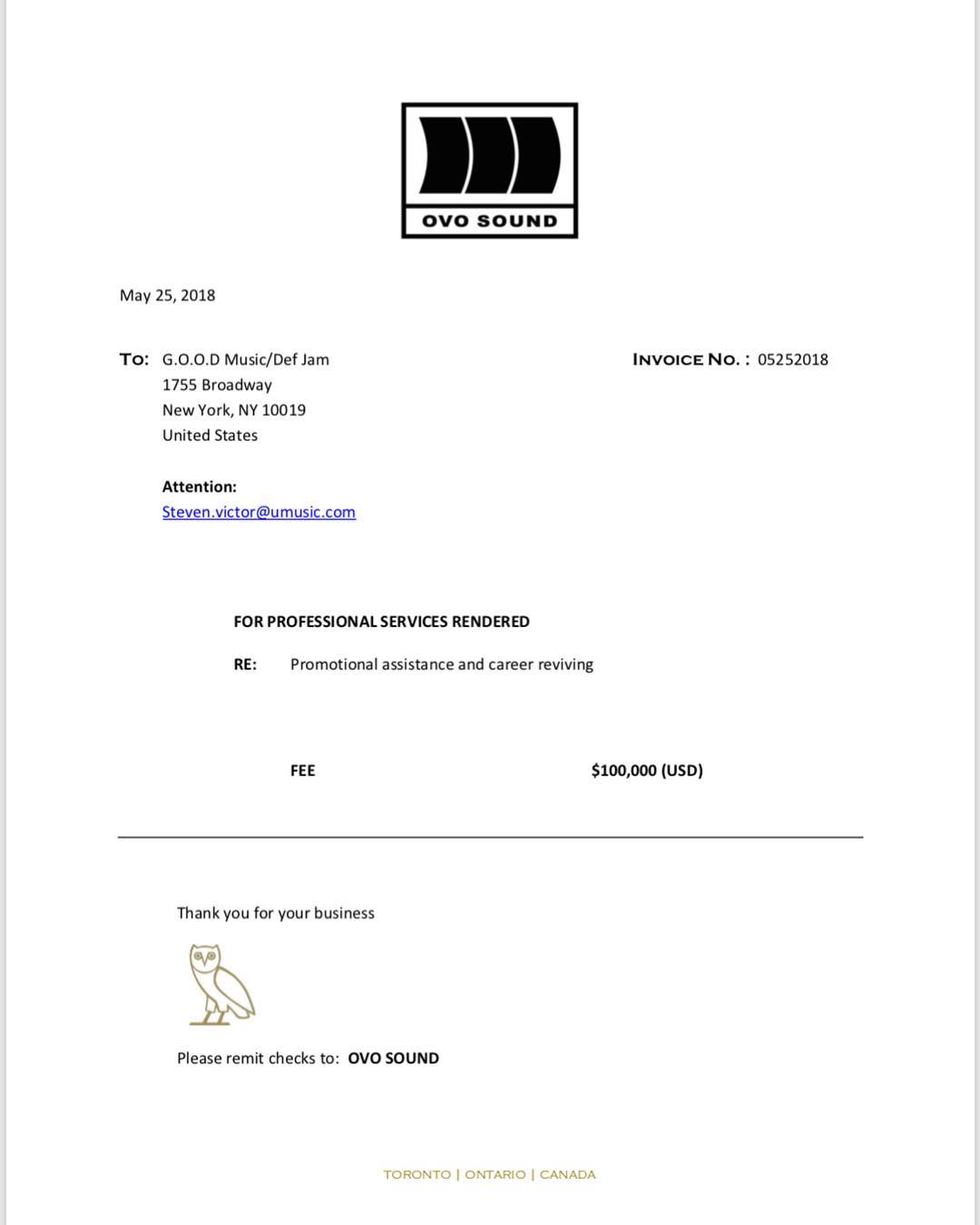 このツイートから間もなくして、ドレイクがSNSを更新。プッシャ・Tのアルバム元であり、カニエが設立した音楽レーベル「G.O.O.D. Music/Def Jam」に宛てた請求書の写真を投稿。「PRの援助とキャリア復帰のため」として、約1,100万円の請求書を送りつけプッシャ・Tを挑発した。