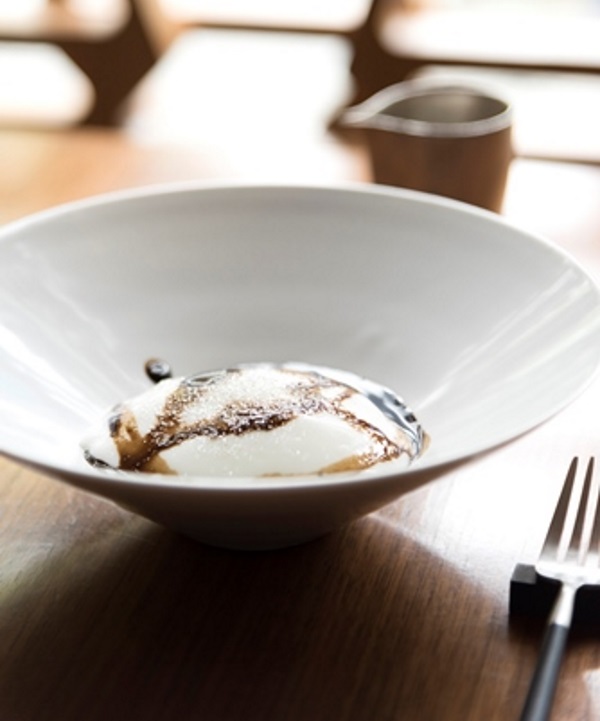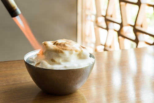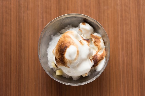 この不思議なかき氷は、林檎、粉糖、卵白を絶妙なバランスで混ぜ合わせてエスプーマにすることで、 エスプーマ内の密度を上げて、氷に熱を通さずに表面だけが炙られる“炙りかき氷”が実現。
