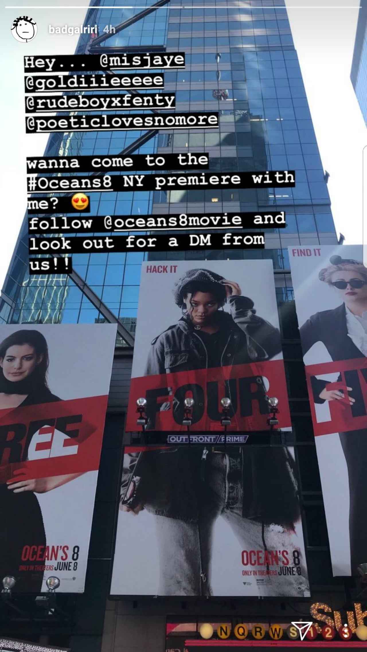 リアーナは、自分がメインで写っている『オーシャンズ8』のポスターと一緒に3人のファンのアカウント名を載せて、「私と一緒に『オーシャンズ8』のプレミアに行かない?@oceans8movieのアカウントをフォローして私たちからのDMを探してみて」とサプライズでファンを誘い出した。