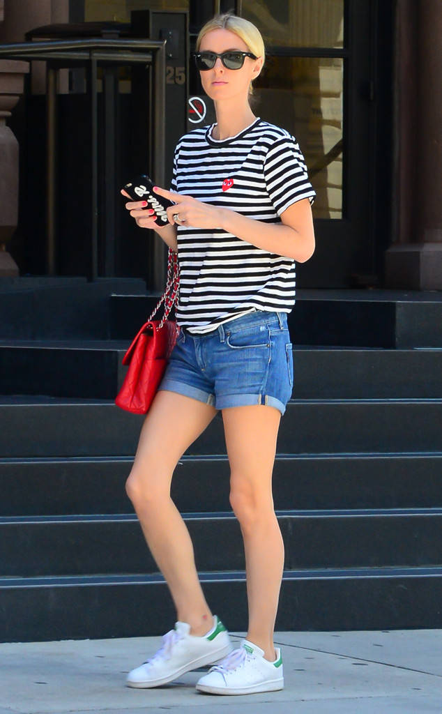 昔からコム デ ギャルソンを愛用するニッキーは、ストライプのロゴTにデニムショーパンを合わせたLAスタイルでお買いものへ。