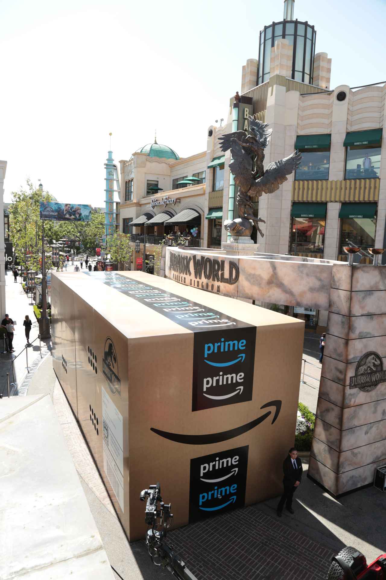 5月30日、ショッピングセンターThe Groveに現れた米アマゾンの配送チーム。彼らがそこに配達したのは、なんと約12メートルものサイズの巨大な箱。アマゾンのダンボールでおなじみのスマイルマークが笑い、封をするテープも貼られているものの、隣に立って警備するガードマンと比較しても、どれだけ規格外の大きさかは一目瞭然。