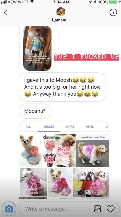 アレックスが混乱していることを知ったプレゼントの送り主が、彼に直接メッセージを送ったことで、「犬用の浴衣」であったことを知ったアレックスは、そのやりとりをスクショしたものをインスタグラムに投稿し、「ああ、俺はやらかした」という自虐コメントでおみやげをめぐる騒動を締めくくった。(フロントロウ編集部)
