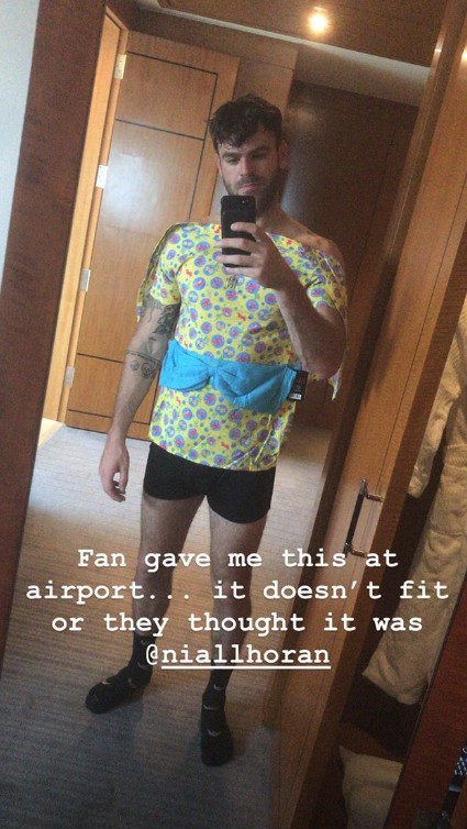 インスタグラムのストーリー機能を使って、ファンからもらった「服」を着て撮影した写真を公開したアレックス。しかし、試しに着てみたはいいものの、サイズが合わず、「ファンの子が空港でこれをくれたんだけど…。僕の体にはフィットしない、もしくはみんな僕のことを(ワン・ダイレクションの)ナイル・ホーランだと思ったのかな」とコメント。