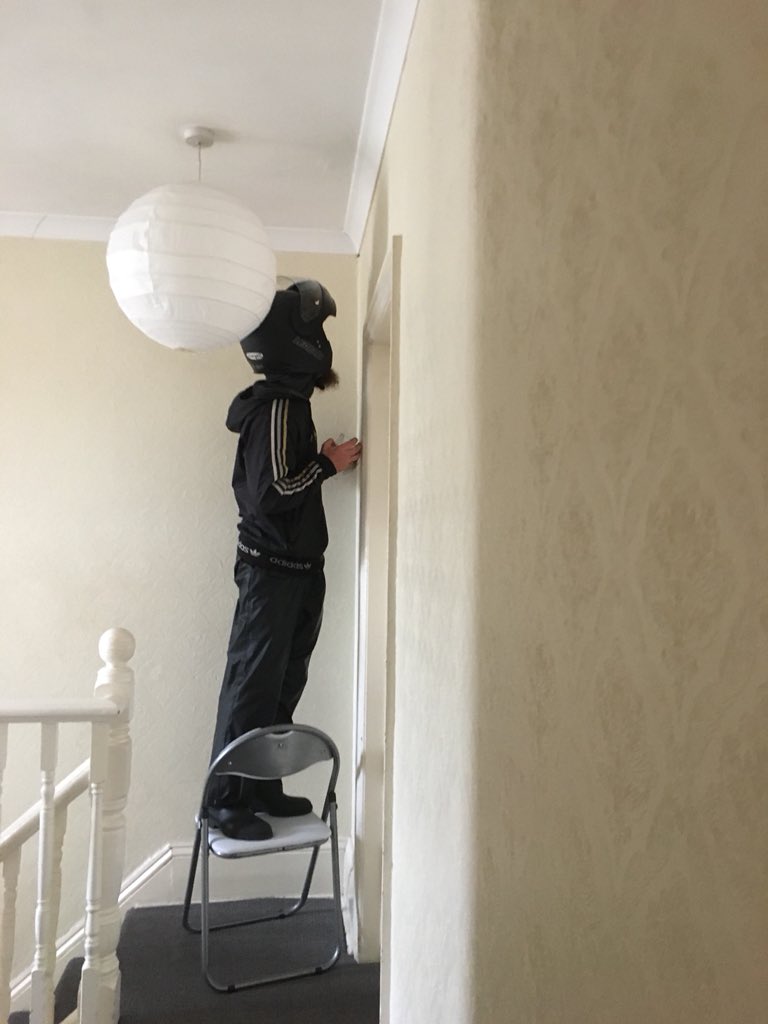 蜘蛛を退治する配達員の男性。