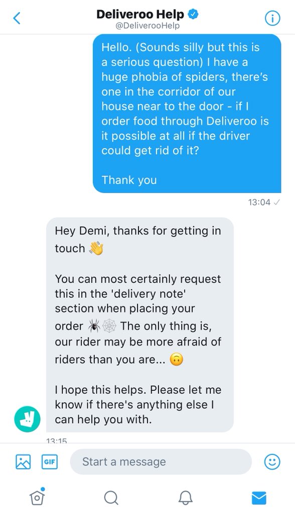 そんな悪魔のささやきが頭をよぎった直後、女性は早速フードデリバリー専用のアプリを使って食べ物を注文。その際のメールのやりとりで、担当者に「配達員の方に蜘蛛を退治してもらうことはできますか?」と質問すると、こんな返事が返ってきた。