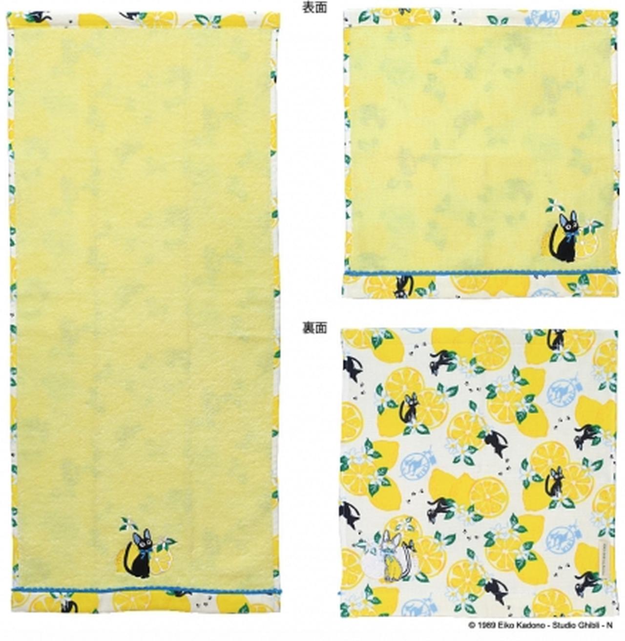さりげなくちょこんと座るジジが可愛らしい、レモンフラワーシリーズ柄のタオルとまくらカバー。タオルは表面がループタオル、裏面がガーゼ素材の両面使える嬉しい仕様。