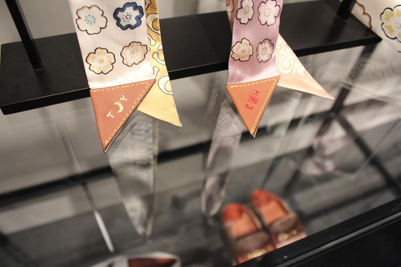 スカーフの先端にはイニシャルを入れたりとパーソナライズできるレザーのタブが施されていて、プレゼントにもぴったりのおしゃれなアイテム。