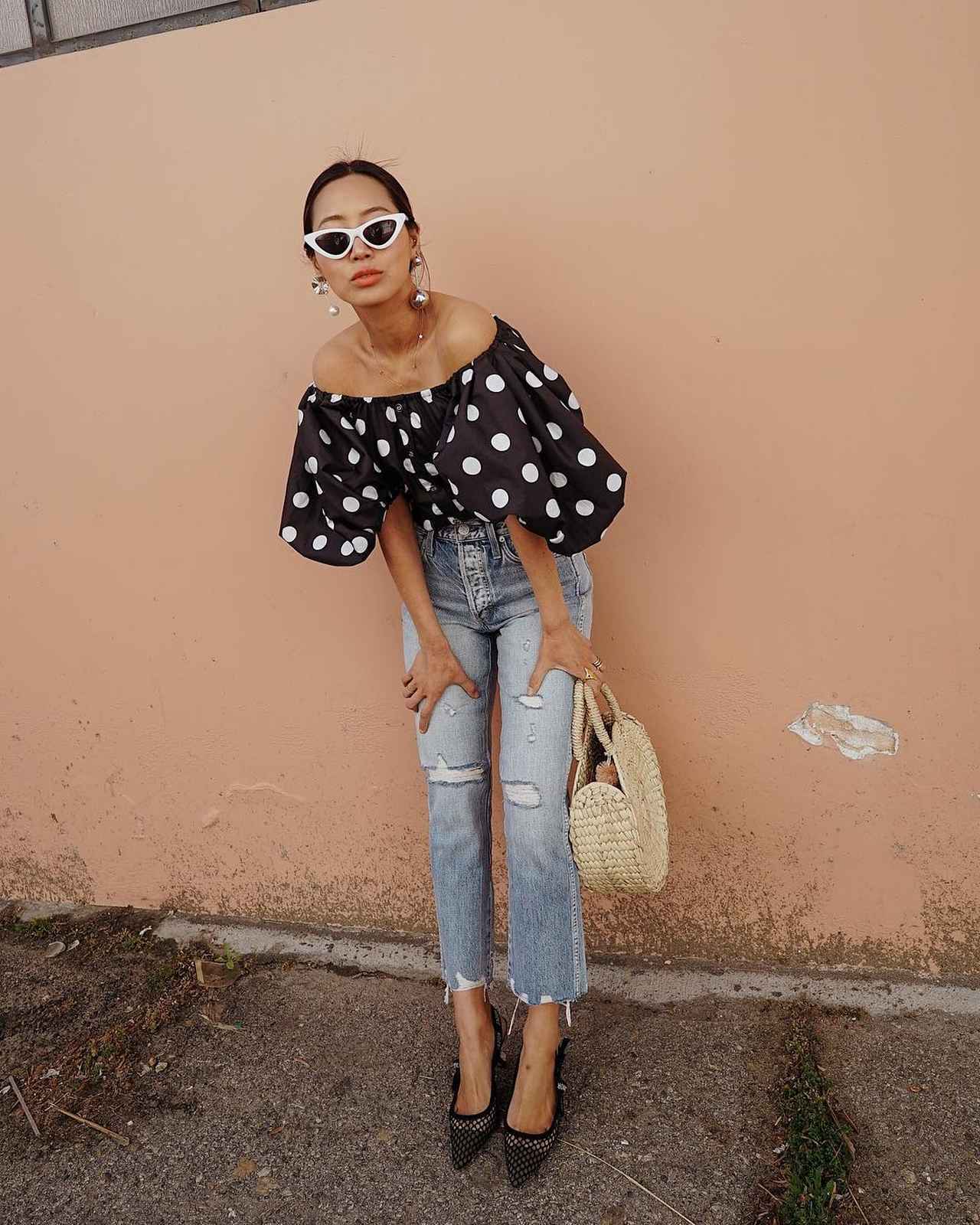 往年のフレンチ女優を思わせるようなラウンド型かごバッグと、色落ちしたダメージデニムは最強コンビ。今季の注目トレンドであるCAROLINE CONSTASのドット柄トップスで旬な要素も取り入れて。パンプスはDior。