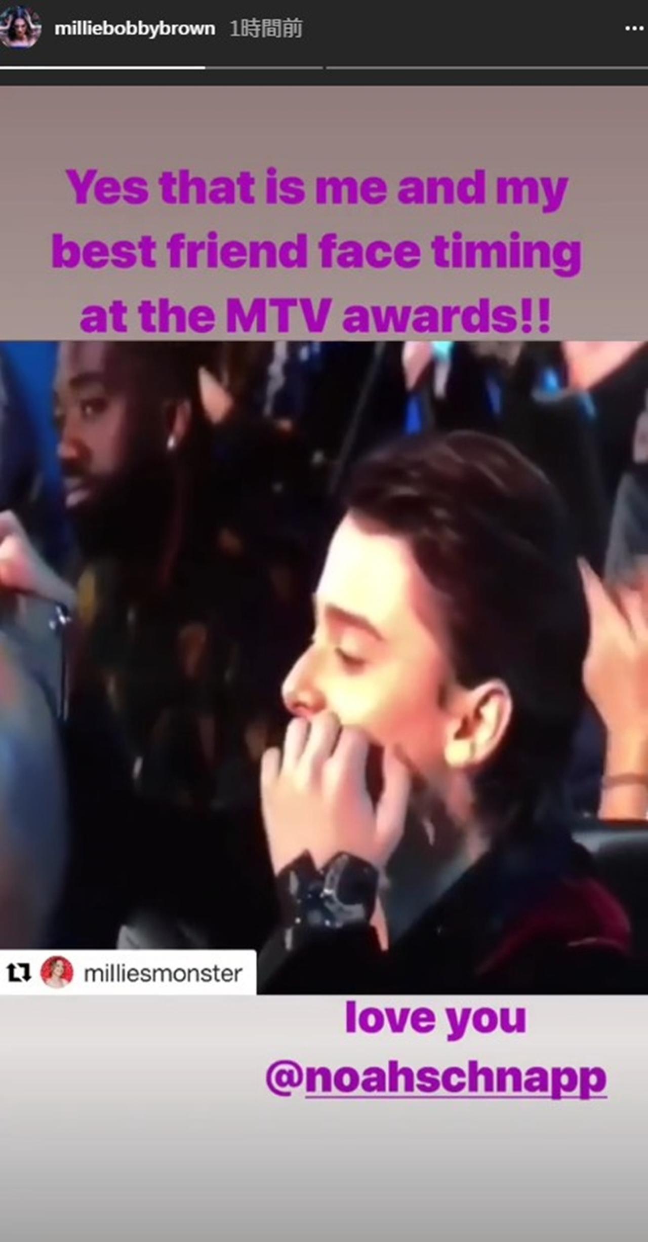 これだけだと、ノアがスマホで誰と話しているのかわからないけれど、後にミリーが自身のインスタグラムで「そうよ。これは私と私の親友がMTVムービー・アワードでフェイスタイムしているところよ!!大好きよ、ノア・シュナップ」と、フェイスタイムしていたことを明かした。