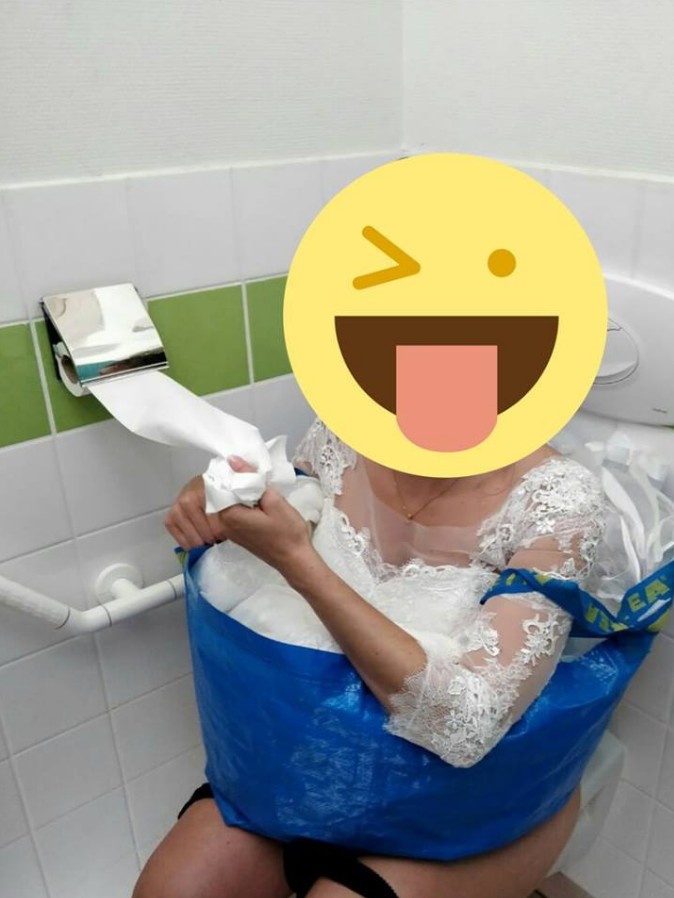 なんと花嫁がフラクタを「履いて」トイレに。フラクタはウエディングドレスでトイレに行くとき、ドレスの裾が収納できるアイテムに早変わり。