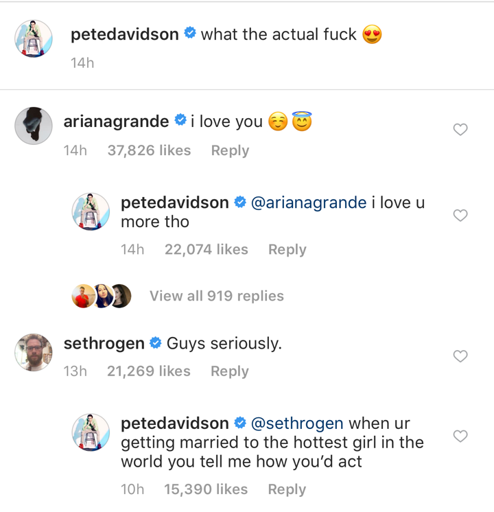 すると、このピートの投稿にアリアナがすかさず「愛してる」とコメント。それに対し、ピートが「もっと愛してる」と返すラブラブっぷりで、おノロケ全開に。