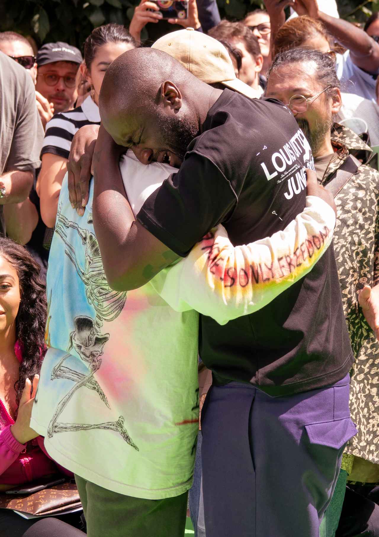 そしてファッションショーも終盤になり、最後にヴァージルがランウェイに登場。ランウェイを歩いていると、最前列にいたカニエ・ウェストを発見。そして、ヴァージルとカニエはお互い熱いハグを交わしながら男泣き。その姿を真横から撮影していたのが、日本を代表するアーティストである村上隆。村上隆は、ヴァージルと一緒に個展を開くなどしており、親交が深いことでも知られている。
