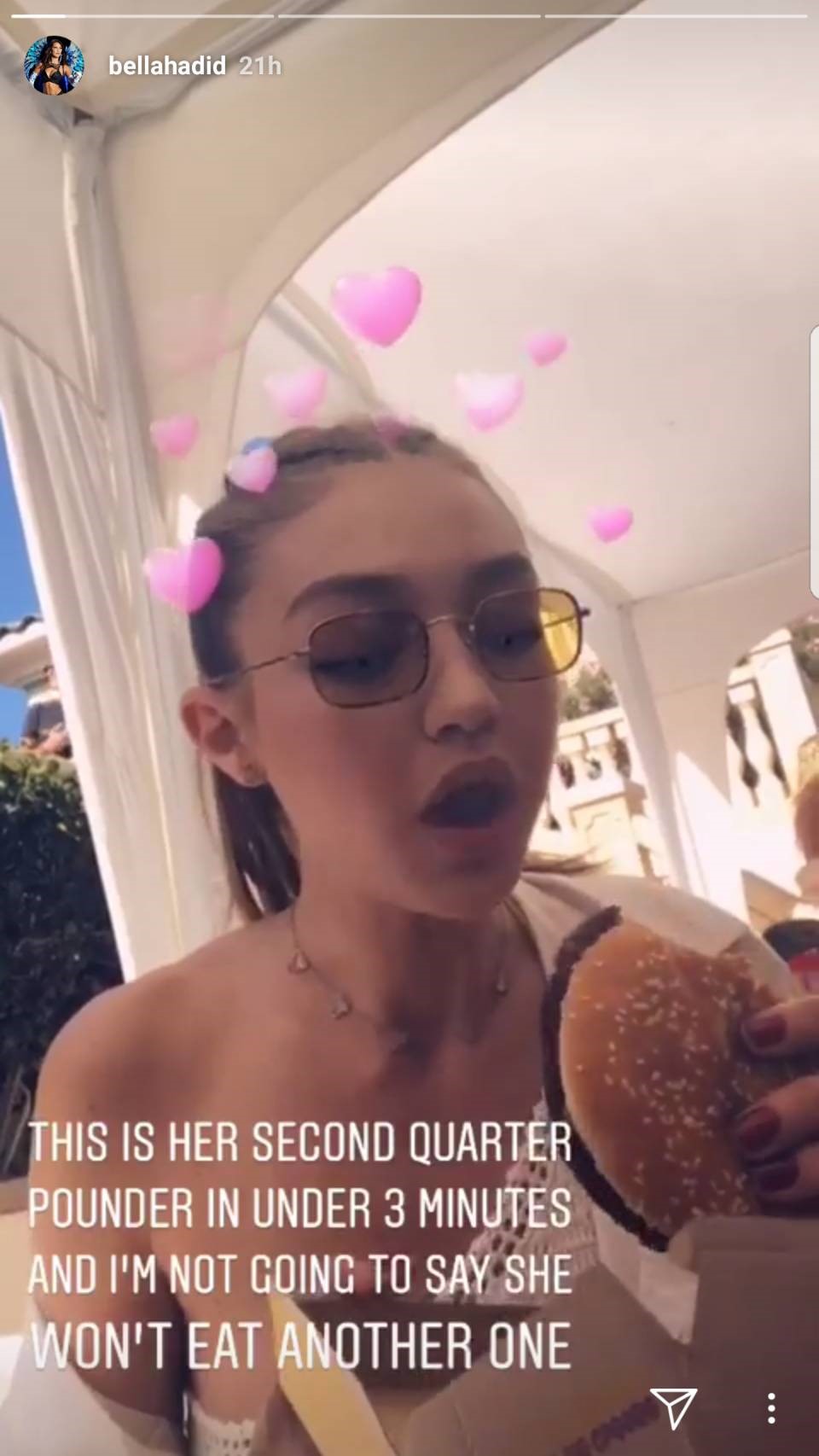 また、姉のジジも負けておらず、先日のコーチェラ・フェスでは3分以内にクウォーターパウンダーを2つも食べたことを、ベラに暴露されている。