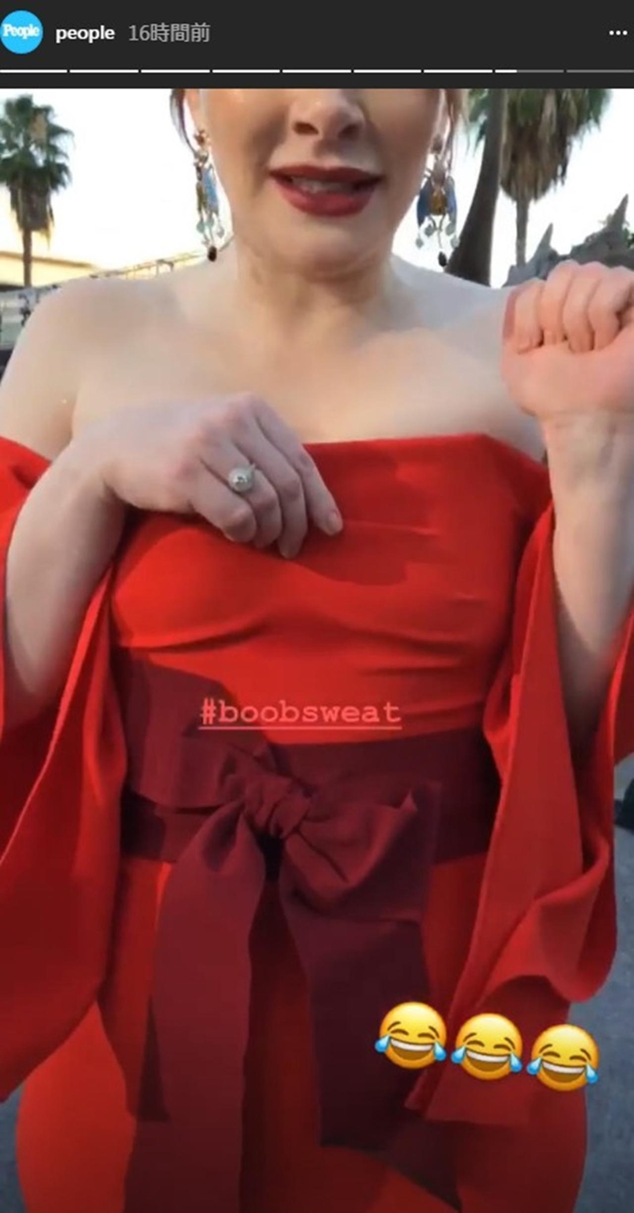 ところがそこは長いキャリアを持つブライス。取材陣を前に自らドレスを持ち上げて、胸の下に汗をかいていることを堂々と公開。ブライスはユーモアある方法でその場を乗り切った。
