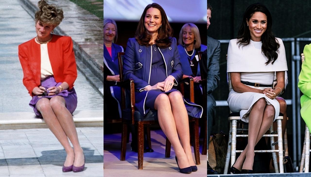 左からウィリアム&ヘンリー両王子の母である故ダイアナ元妃、キャサリン妃、そしてメーガン妃。先日、初めてエリザベス女王との公務に挑んだ際には、メーガン妃もこの「ダッチェス・スラント」と呼ばわれる座り方を実践していた。