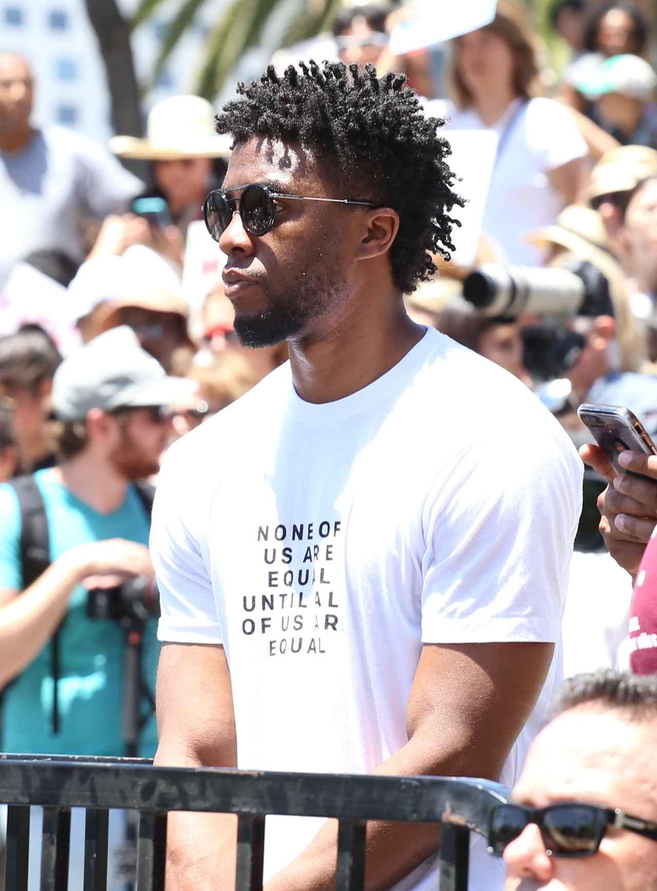 映画でスーパーヒーローのブラックパンサーを演じるチャドウィックは、「すべての人たちが平等になるまで、誰も平等ではない」というメッセージが書かれたTシャツを着て参加。