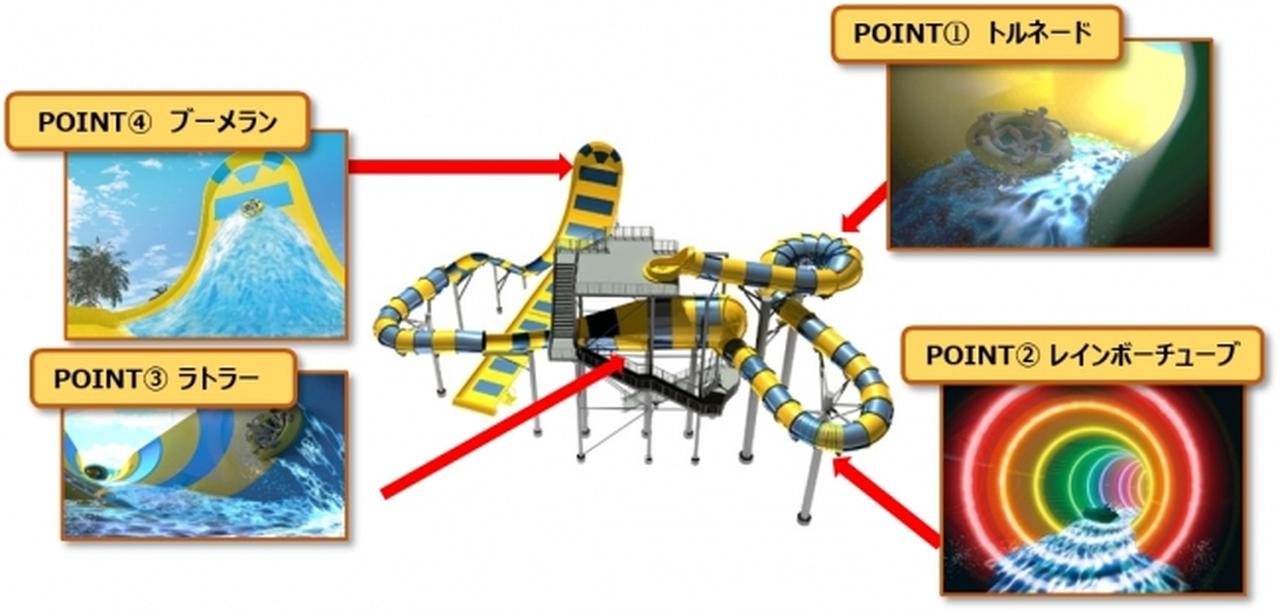 2~3人乗りの対面式専用ボートに乗り、高さ約21メートルのスタート台から滑走。スタート直後には、暗闇を渦を巻きながら急降下する“トルネード”、さらに興奮冷めやらぬ中、スライダー内がレインボーに光るイルミネーションゾーン“レインボーチューブ”をくぐりぬけた後、大迫力な横揺れを体感できる“ラトラー”、フィニッシュを迎える直前には、ボートが空高く壁を登る“ブーメラン”が待ち構えている。その後は一気に急降下!