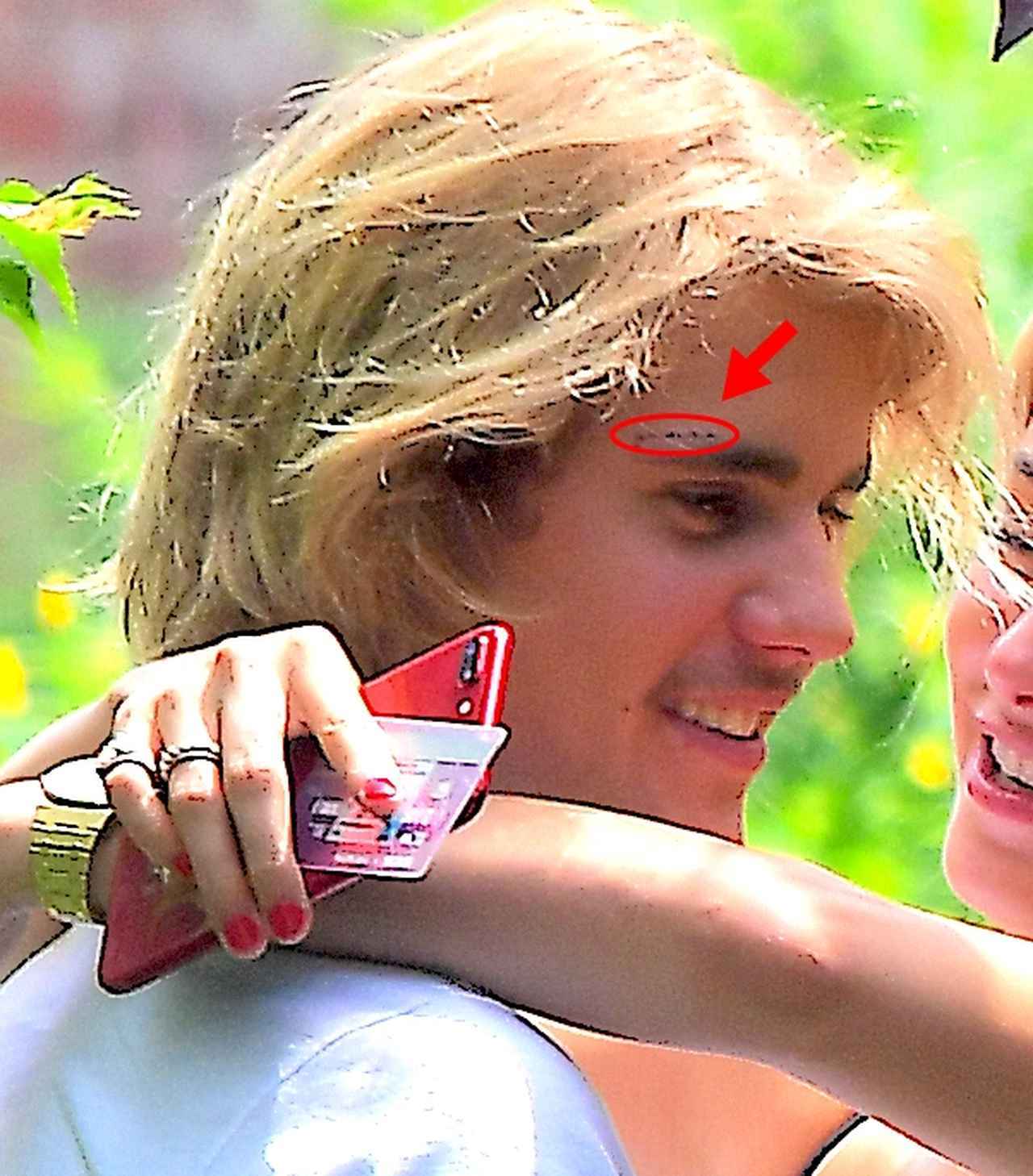 これらの写真をめぐって、ジャスティンのファンからは「傷口を縫ったあとのように見える」「眉毛の剃り残しでは?」「あれは絶対にタトゥー」など様々な意見が出ているが、先日、ジャスティンが以前からひいきにしている彫師のもとを訪れていたことから、上の写真に写る「黒い点々」の正体がタトゥーである可能性は十分にある。