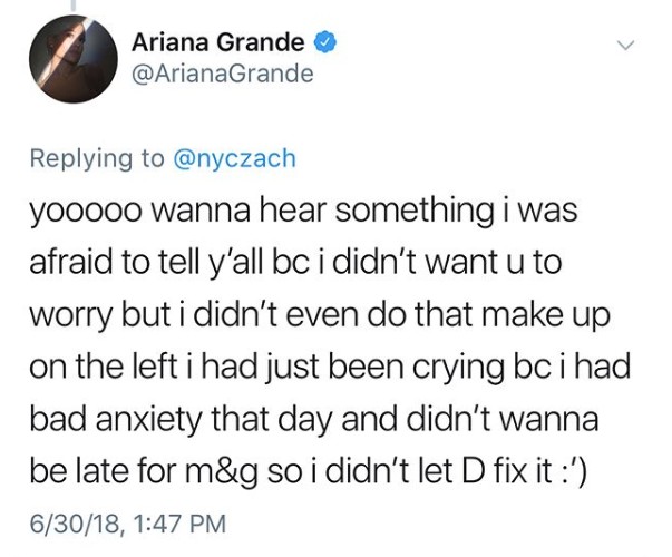 昨年、自身のコンサートで起きた自爆テロ事件がきっかけで、PTSD(心的外傷後ストレス障害)を発症したことを公表しているアリアナは、これまでにも何度か不安障害(Anxiety)のような症状に見舞われたことをSNSやインタビューで明かしてきた経緯がある。