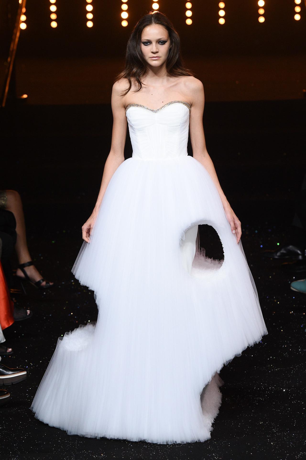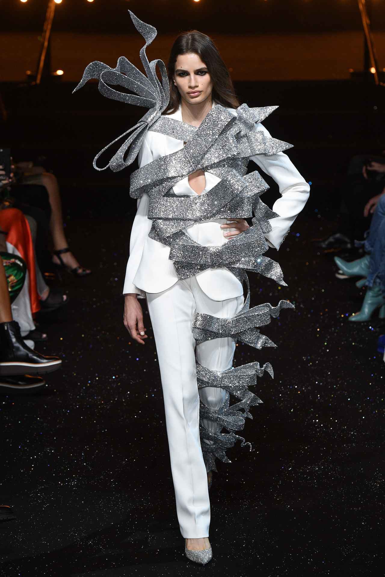 実は今回ヴィクター&ロルフは、ブランド設立25周年という節目の年。ということで、今回のコレクションでは、過去に話題になったルックを白で再現しており、この巨大マクラのルックもオマージュとして登場した。そのほかにも話題になったインパクト大のルックがランウェイに。