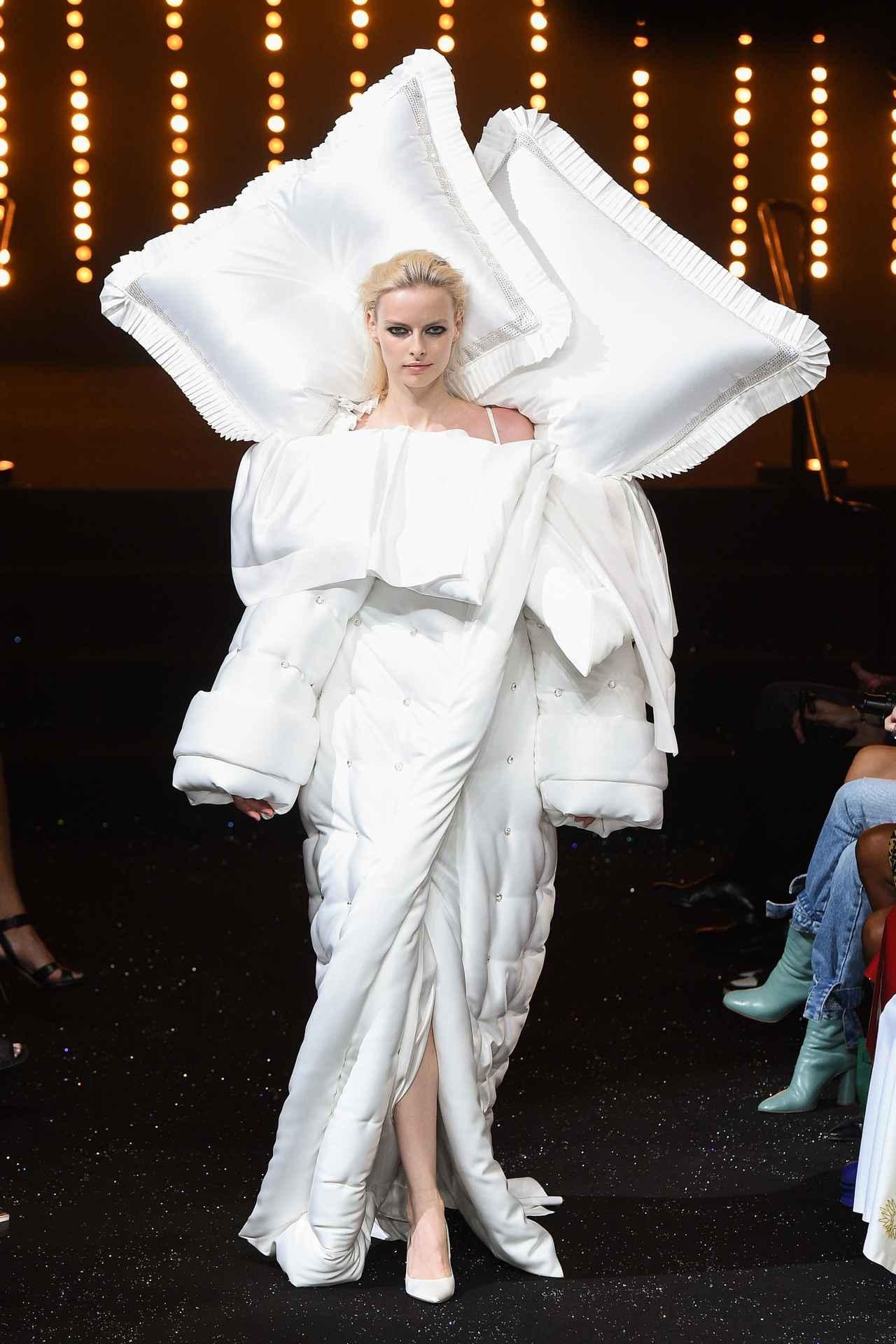 モデルは巨大なマクラを背負っており、ドレスもまるで布団のようでインパクト大。この斬新なルックは、今回初披露のルックではなく、2005年のフォールコレクションで公開され大きな話題を呼んだルック。
