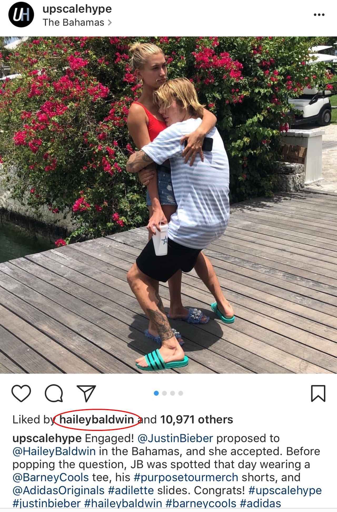 ヘイリーが「いいね」をしたのは、セレブのファッションやゴシップを主に扱うインスタグラムアカウントの投稿で、ジャスティンとヘイリーが「婚約した(Engaged)」ことについて書かれた内容のものだった。