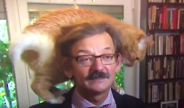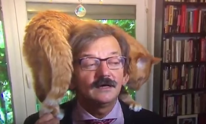 ある学者がインタビューを行っている最中に、飼い猫が乱入! それでも当たり前のようにインタビューを続ける学者と自由気ままな猫の様子が可愛い。
