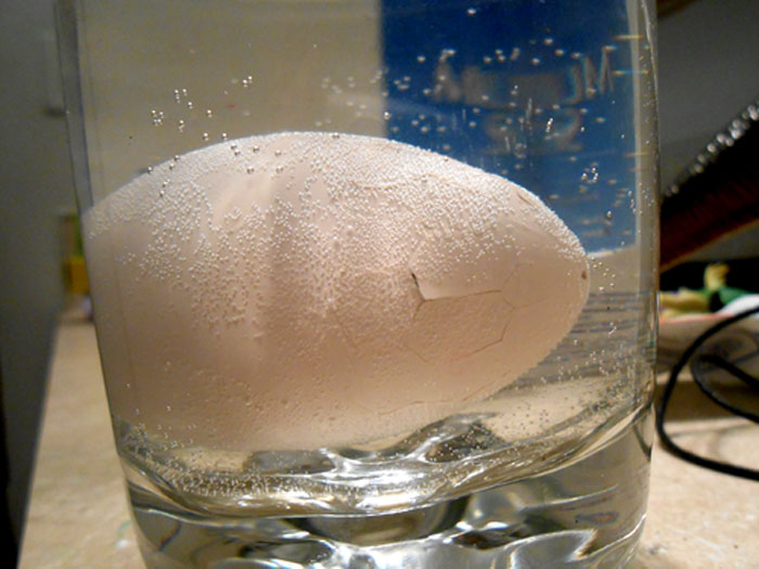 コップに入れた水の中に卵を入れて待ってみたところ、9時間が経過したあたりで殻の表面にヒビが入り始めた。