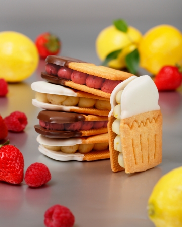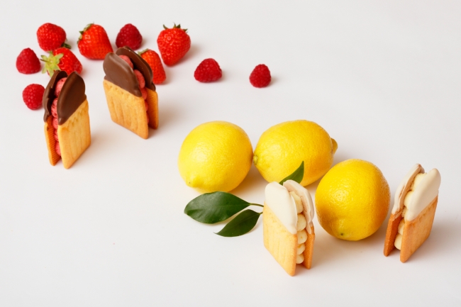 果実をまるごと煮込んだ自家製のみずみずしいジャムと、ホイップしたフレッシュバターのみで作った“ジャムバター”クリームを、1枚1枚丁寧に焼き上げたカップケーキ型の可愛いビスケットで挟んだ。