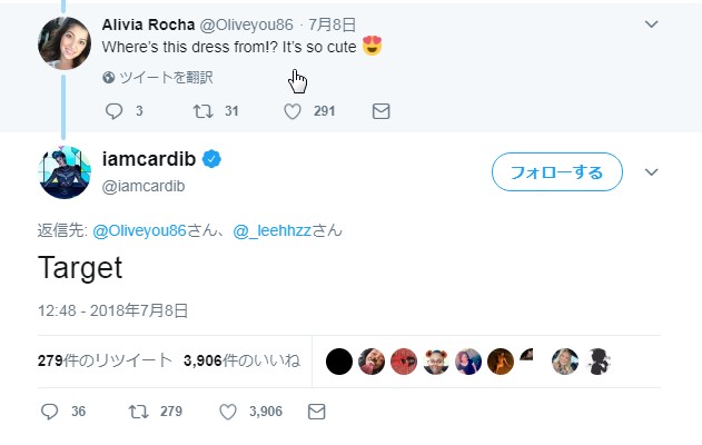 そうすると、なんとカーディから直々に返信が。カーディはワンピースの購入先について「ターゲットよ」返信。ダーゲットとは、アメリカで人気のスーパー。そんな庶民的なターゲットでカーディがワンピースを購入したことが判明し話題に。