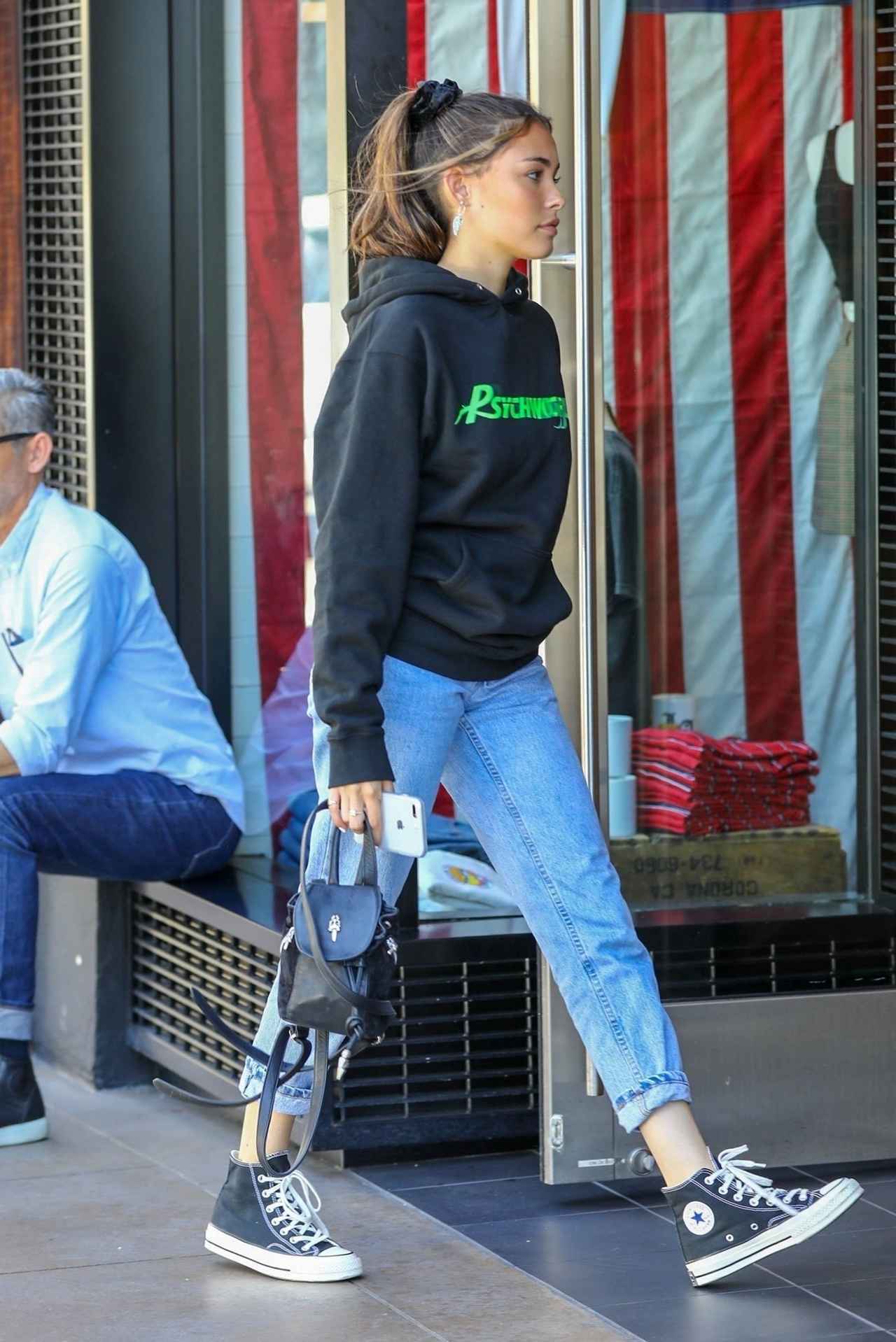 この日はショート丈キャミソールにパーカを羽織り、デニムショートパンツとCONVERSEのスニーカーという定番カジュアルスタイルのマディソン。肩からかけたGUCCIのショルダーバッグがアクセントに。