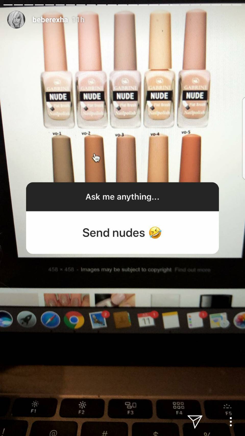 彼女は「ヌード(NUDE)」を要求されて、「NUDE」と書かれたヌードカラーのマニキュアのボトルが並んだ写真で返答。さらに写真をよく見てみると、パソコンのカーソルも「コレよ」と言わんばかりにヌードカラーのボトルを指している。ビービーは多くのファンが注目するなか、あえてこの悪質な質問を公開で撃退した。