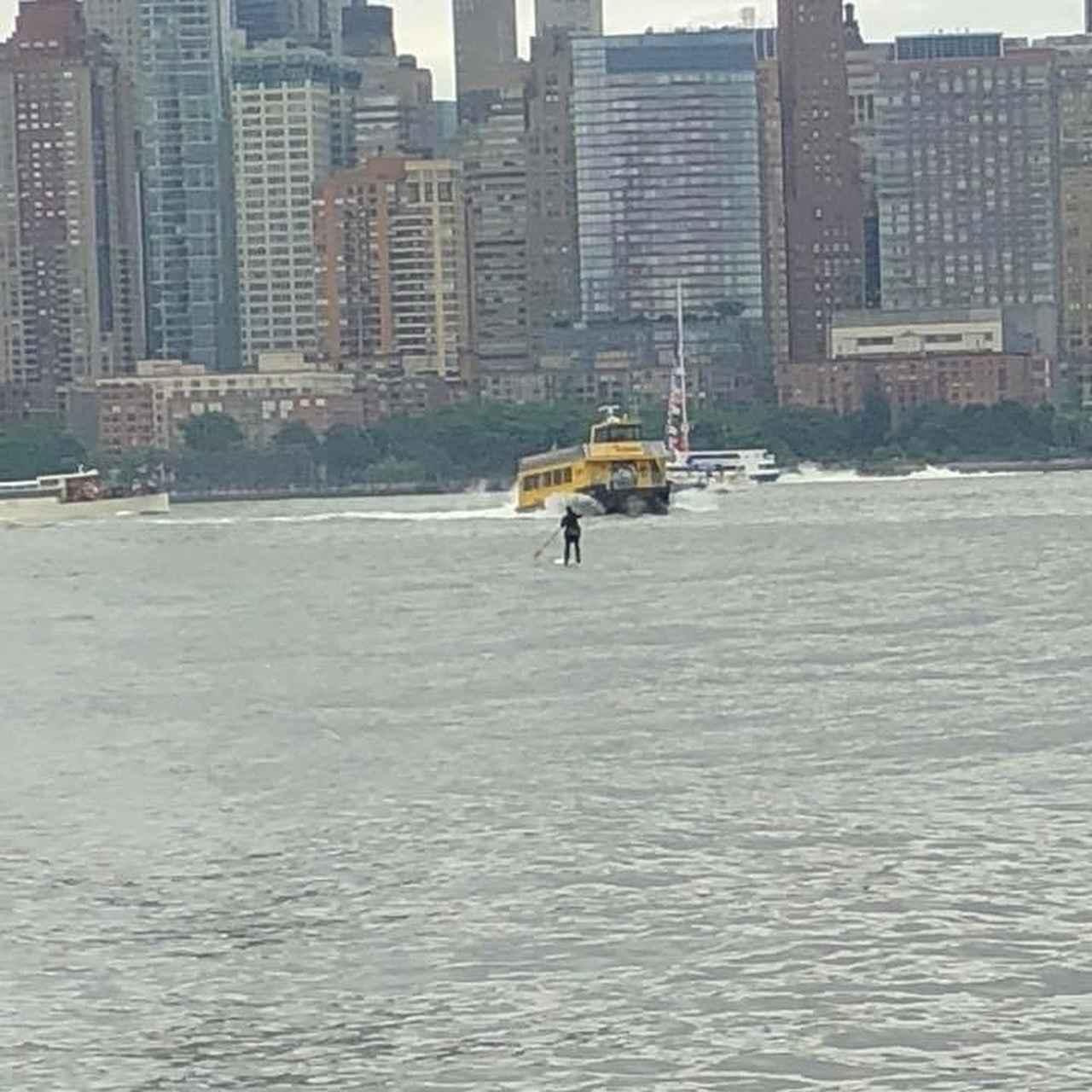 スーツを着用した男性が、ハドソン川をパドルボートで横断している姿を目撃され、衝撃が走っている。