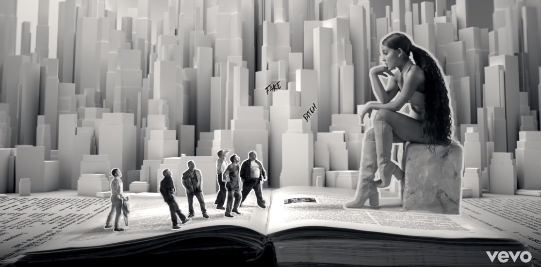 白い高層ビルがひしめく背景の前に置かれた巨大な本の上に座ったアリアナが、小さな男性たちの集団に「BITCH(ビッチ/あばずれ)」、「FAKE(フェイク)」、「ANNOYING(ウザい)」、「LITTLE WHORE(小さな売女)」などの罵声を投げつけられるモノクロのシーン。怒りや憎しみを露わにする男性たちをアリアナは涼し気な表情で見下ろしている。
