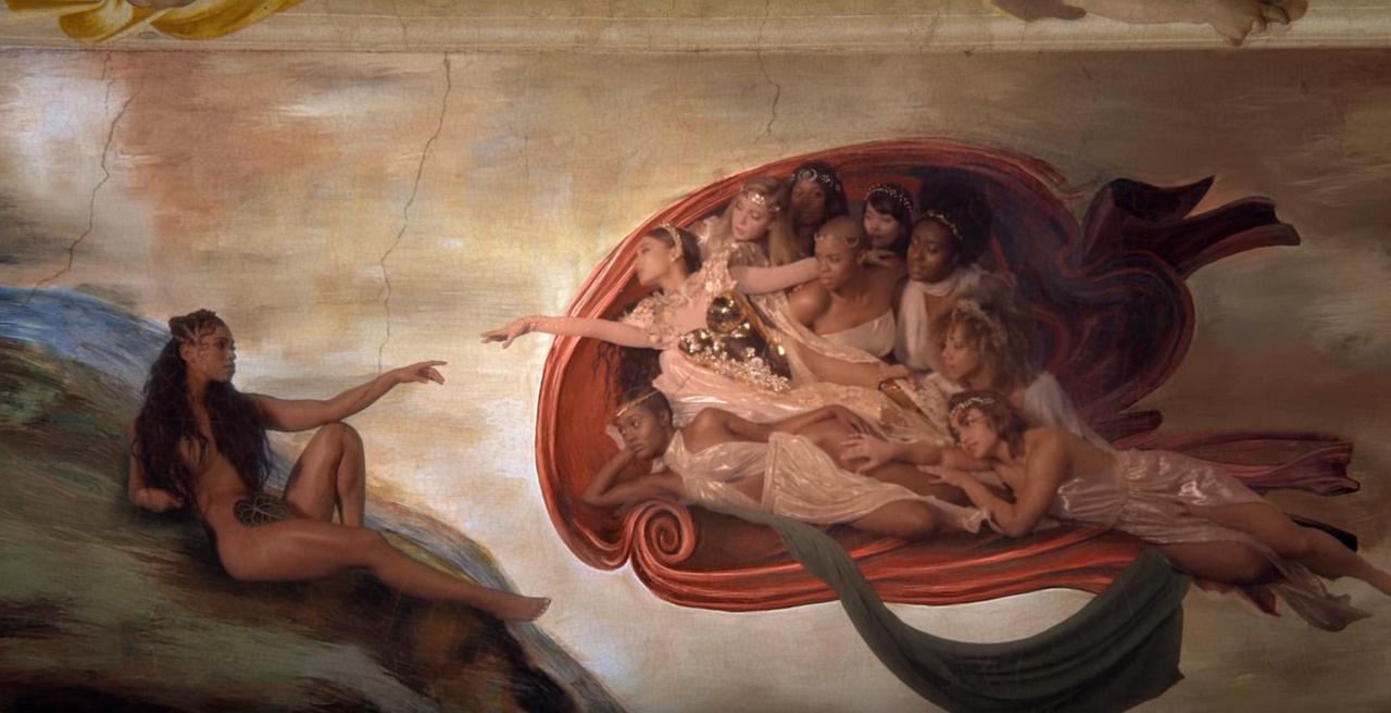 旧約聖書の『創世記』に記された神が、最初の人類たる「アダム」(男性)に生命を吹き込む場面を表現しているとされている名作だが、アリアナのバージョンでは、アリアナ演じる神も、そして生命を吹き込まれる人物も女性に。この女性は『創世記』の中でアダムの相手として描かれている「イヴ」なのではないかと解釈する人も。