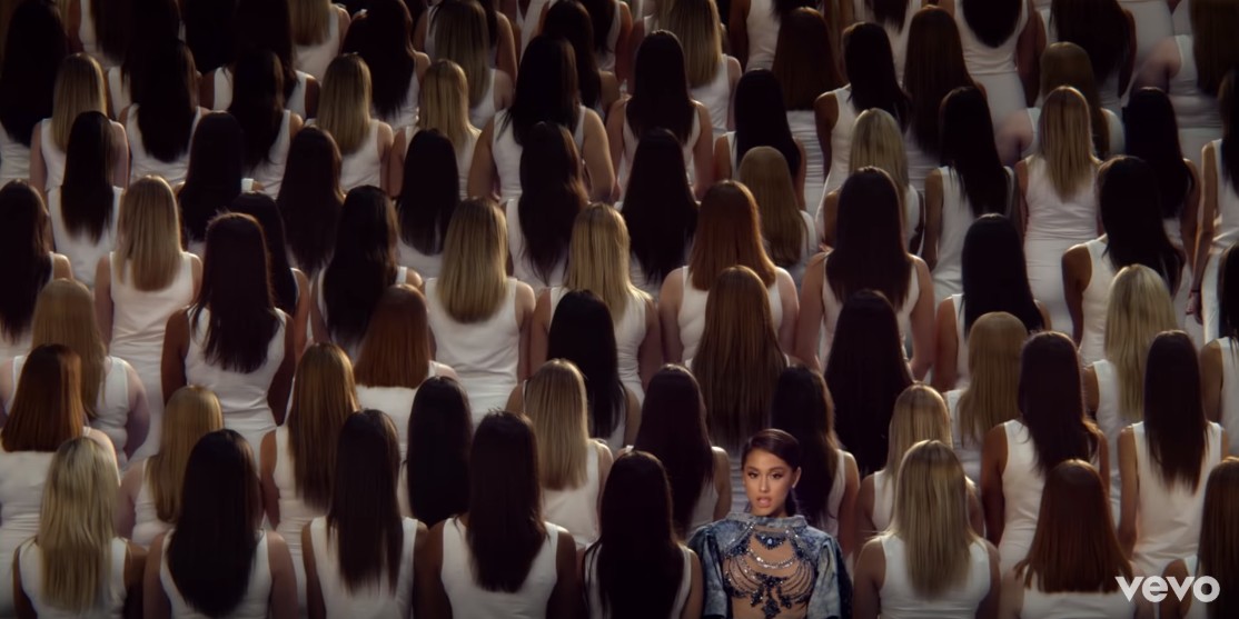 白いタンクトップを着て後ろを向いている長い髪の女性たちの群れに紛れ、アリアナ1人だけがカメラ目線で何かを訴えるように歌っているシーン。